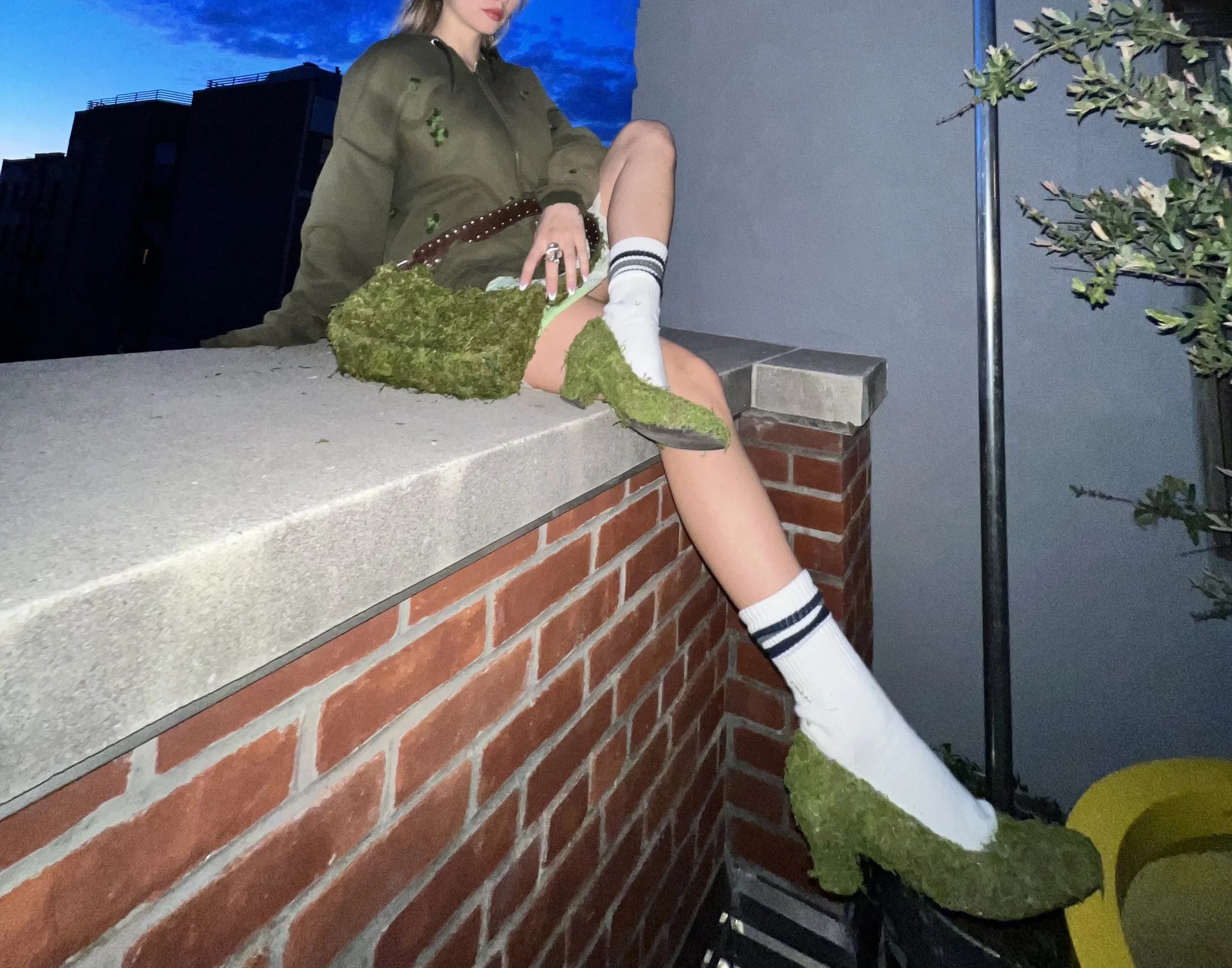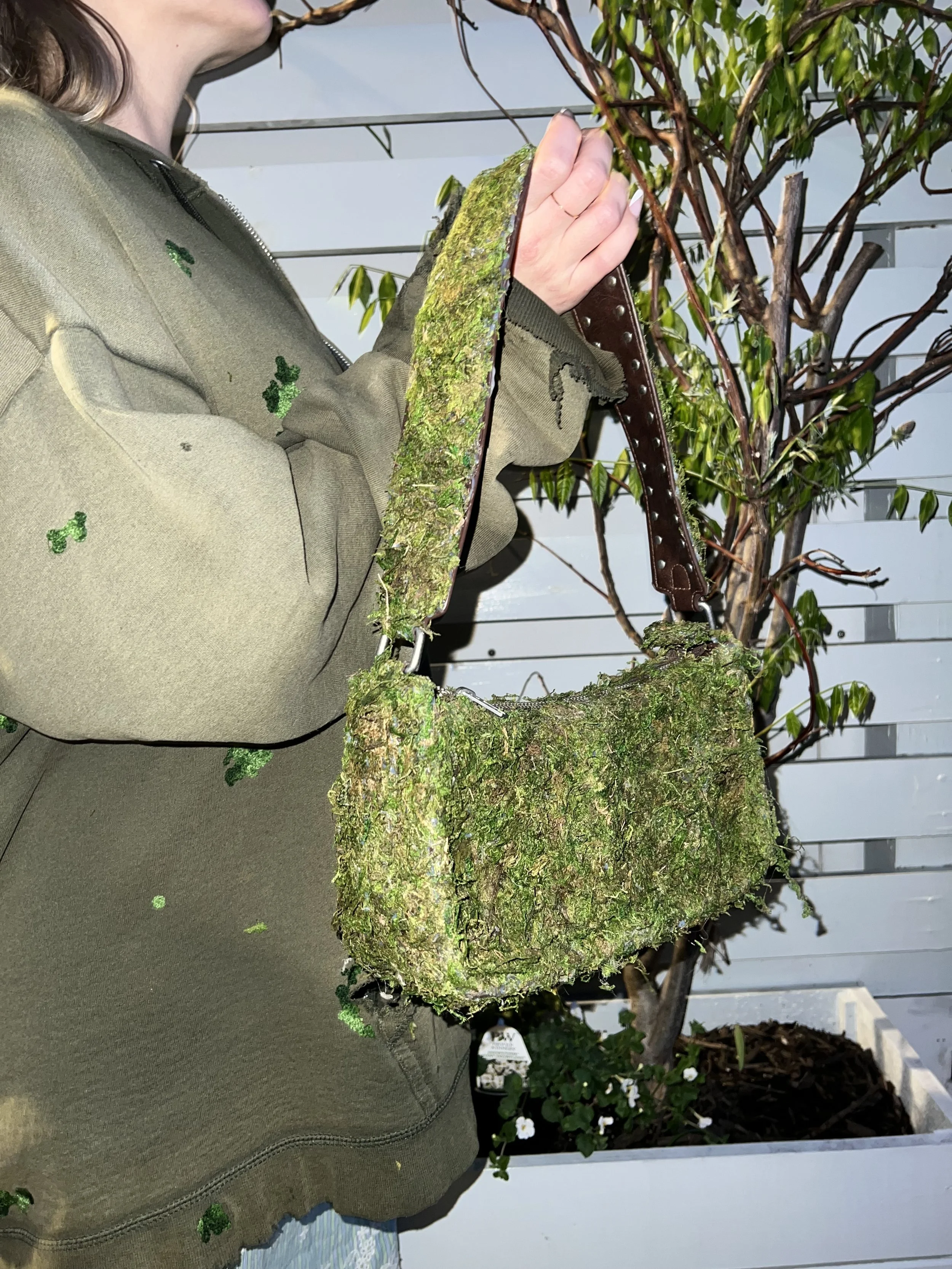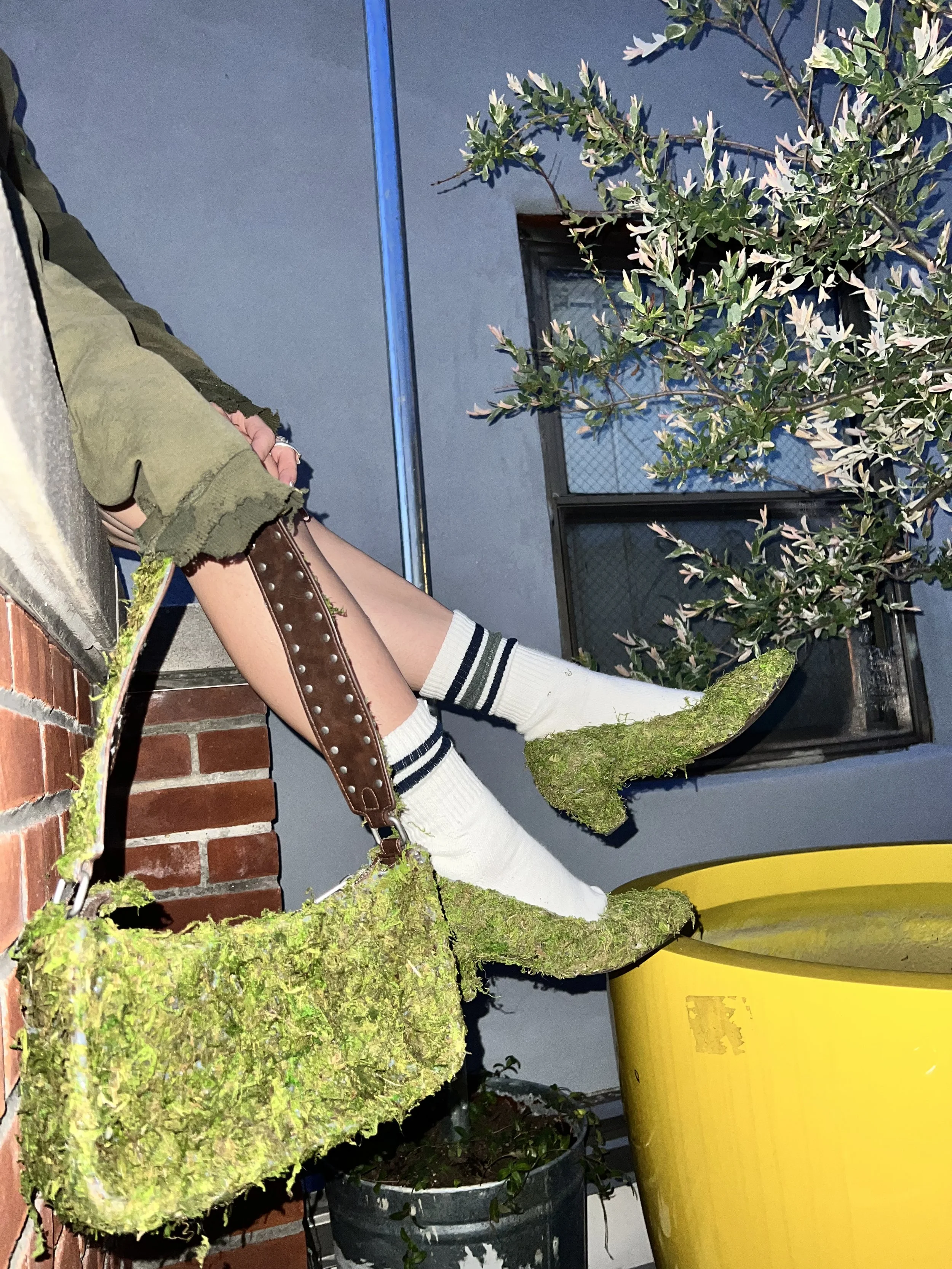 Rooted Resistance is a wearable installation composed of a moss-covered bag and shoes, created to disrupt the traditional boundaries between fashion, nature, and sustainability. This project emerges as a living critique of a system that extracts endlessly from the Earth without giving back. By working with natural materials—organic moss, soil, and biodegradable components—the piece invites reflection on our disconnection from the land and the environmental cost of modern consumer habits.